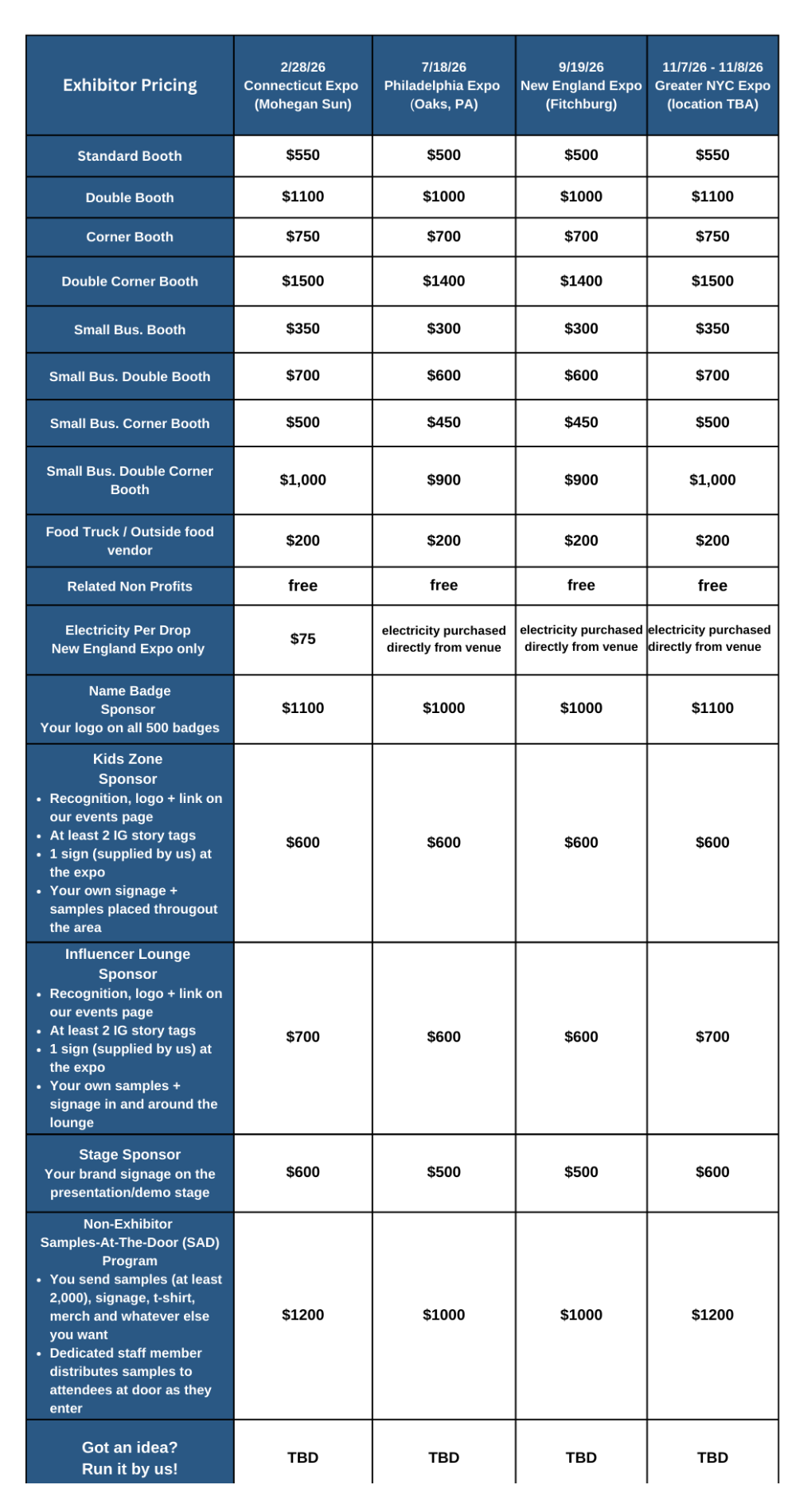- Small Business Booth Pricing available – we want everyone to join the party!